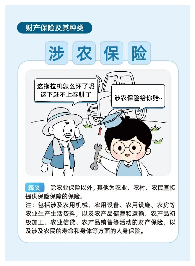 注:包括涉及农用机械、农用设备、农用设施、农房等农业生产生活资料,以及农产品储藏和运输、农产品初级加工、农业信贷、农产品销售等活动的财产保险,以及涉及农民的寿命和身体等方面的人身保险。